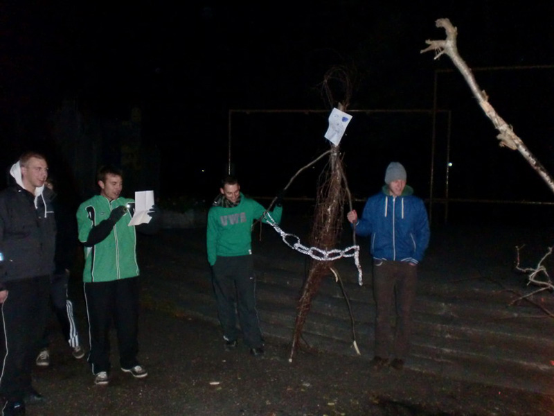Nachdem die Anklage vorgelesen wurde, warfen die Jungs die Hexe ins Feuer